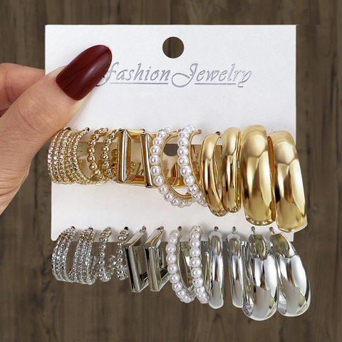 9 paires/ensemble de boucles d'oreilles créoles chunky minimalistes élégantes bijoux de lustre en forme de C à la mode pour les fêtes en alliage