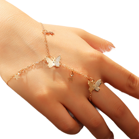 2023 패션 골드 도금 스타 나비 손가락 반지 및 팔찌 세트 결혼식과 선물을위한 여성을위한 트렌디 한 합금 보석