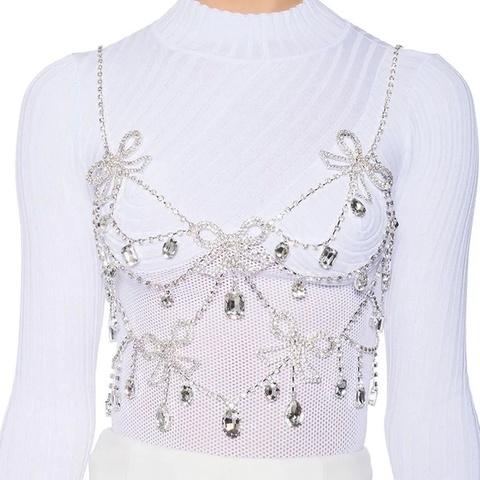 เสื้อชั้นในคริสตัลผูกโบว์สายโซ่ประดับพลอยเทียมเสื้อครอปบิกินี่ชายหาดสายรัดอกเครื่องประดับร่างกายสำหรับผู้หญิง